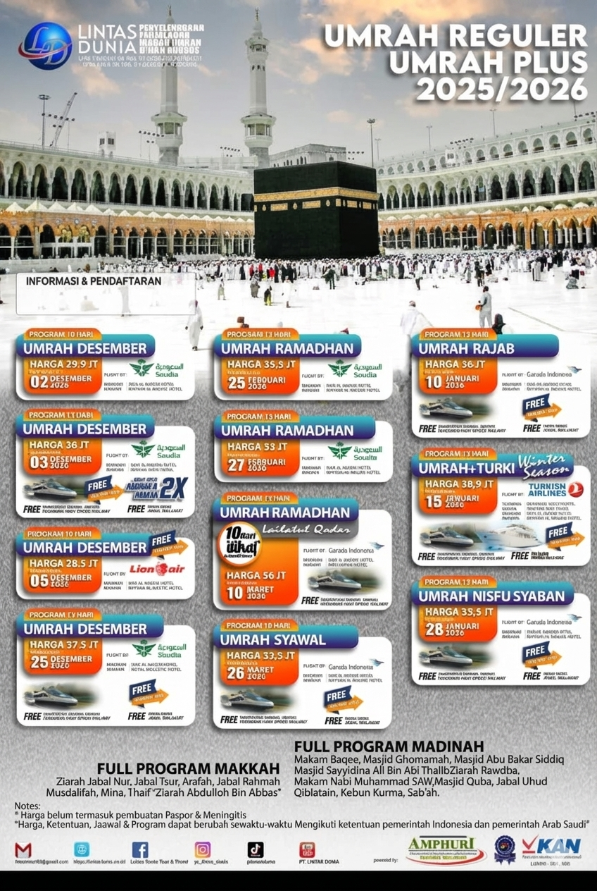 Selamat Datang di website resmi kami PT. LINTAS DUNIA, merupakan penyelenggara umroh dengan izin resmi dari Departemen Agama Republik Indonesia dengan no PPIU . PT. LINTAS DUNIA menyediakan paket perjalanan ibadah umrah mulai dari paket regular sampai dengan umrah VVIP bintang 5. Kami mempunyai standard pelayanan dengan Harga paket yang kompetitif. PT. LINTAS DUNIA juga melayani request paket pribadi atau korporat sesuai kebutuhan pelanggan dan mitra kami.