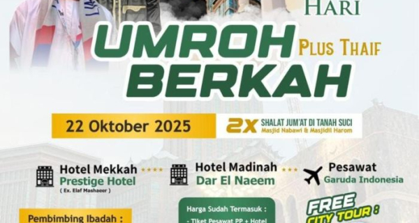 Menunaikan ibadah umrah adalah impian setiap Muslim. Ibadah ini bukan hanya perjalanan spiritual, tetapi juga bentuk penyucian diri, mendekatkan diri kepada Allah SWT, sekaligus mengunjungi tempat-tempat bersejarah dalam dakwah Rasulullah SAW. Untuk Anda yang berencana berangkat umrah di tahun 2025, kini telah hadir program istimewa dari PT Lintas Dunia Bandung bekerja sama dengan KBIU Al-Huda Kebonlega β Bandung, yaitu Umrah Berkah Plus Thaif Oktober 2025.